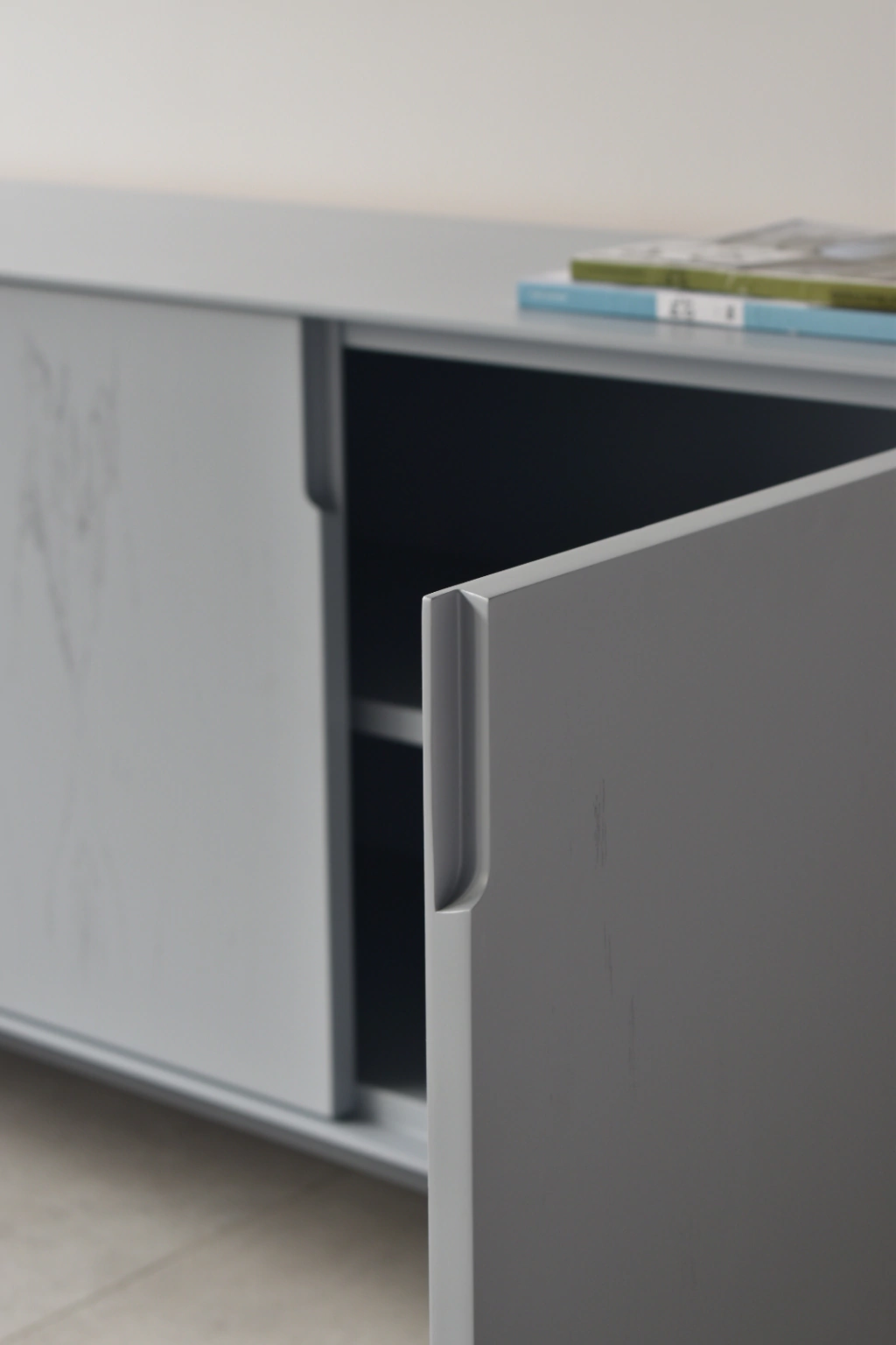 Material: Base de hierro. Nicho de MDF laqueado semimate y puertas de Paraíso lustrado a poro abierto.